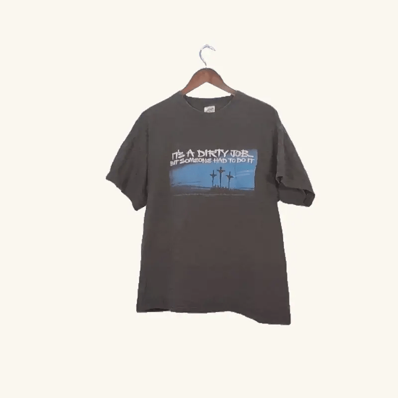 Get ready to make a statement with this "It's a dirty job but someone had to do it" Graphic Tee! This bold and eye-catching shirt comes in size XL and features a graphic of 3 crosses, perfect for expressing your style and passion. Don't be afraid to stand out and make a statement with this tee!
